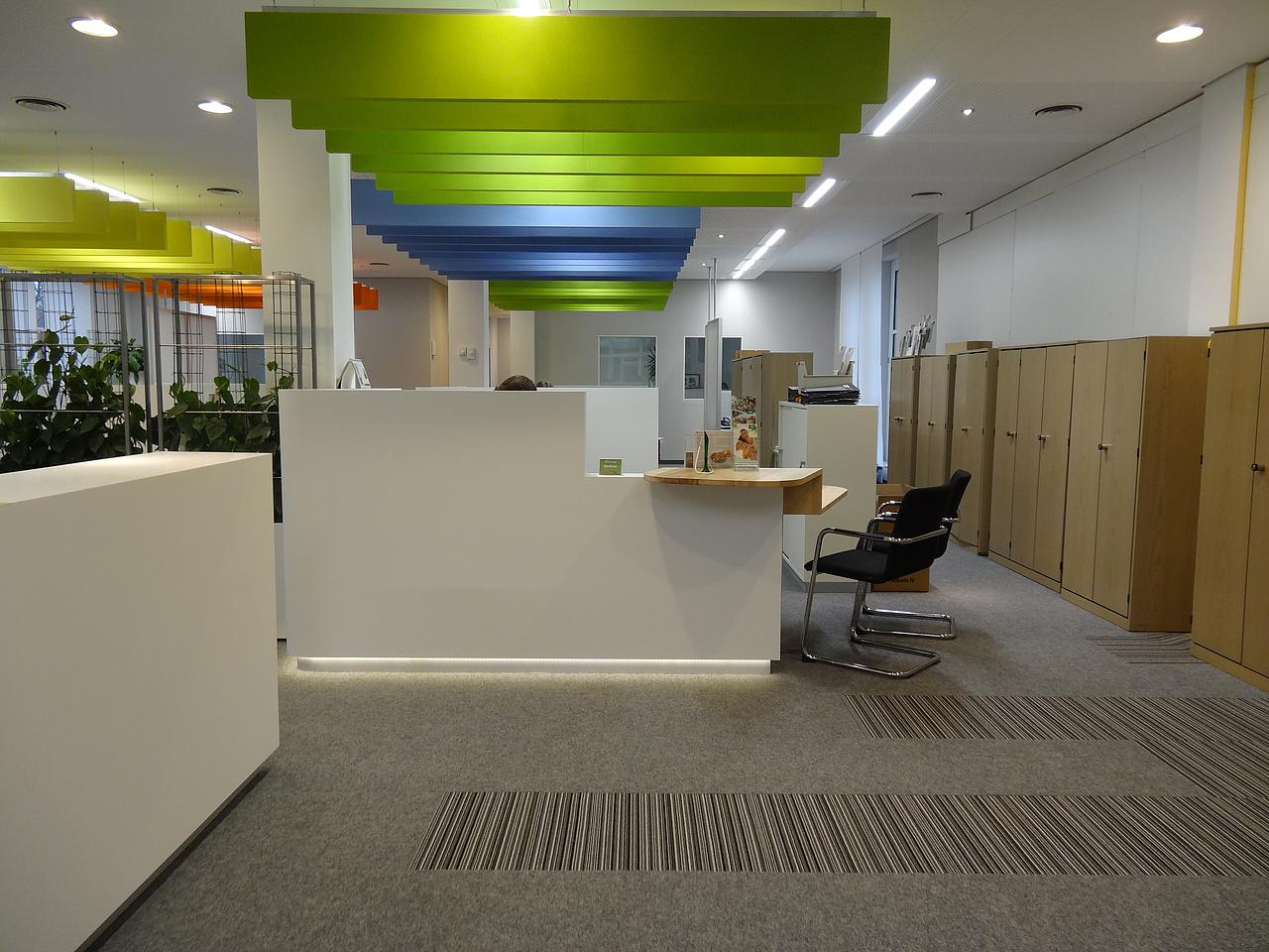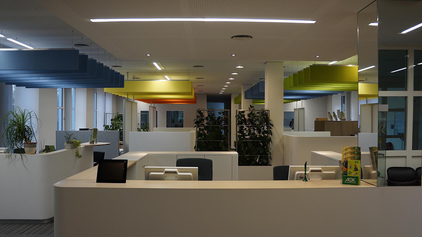 Räumlich unstrukturiert im 70iger-80iger Jahre Stil präsentierte sich bis vor kurzem der Servicebereich der AOK Direktion in Landsberg. Die Aufgabenstellung an das Innenarchitekturbüro bestand unter anderem darin, die im Großraumbüro untergebrachten Beratungsplätze zu zonieren unter Wahrung der Diskretion, Privatheit und Sicherheit.