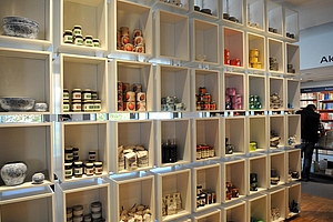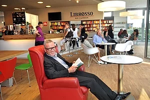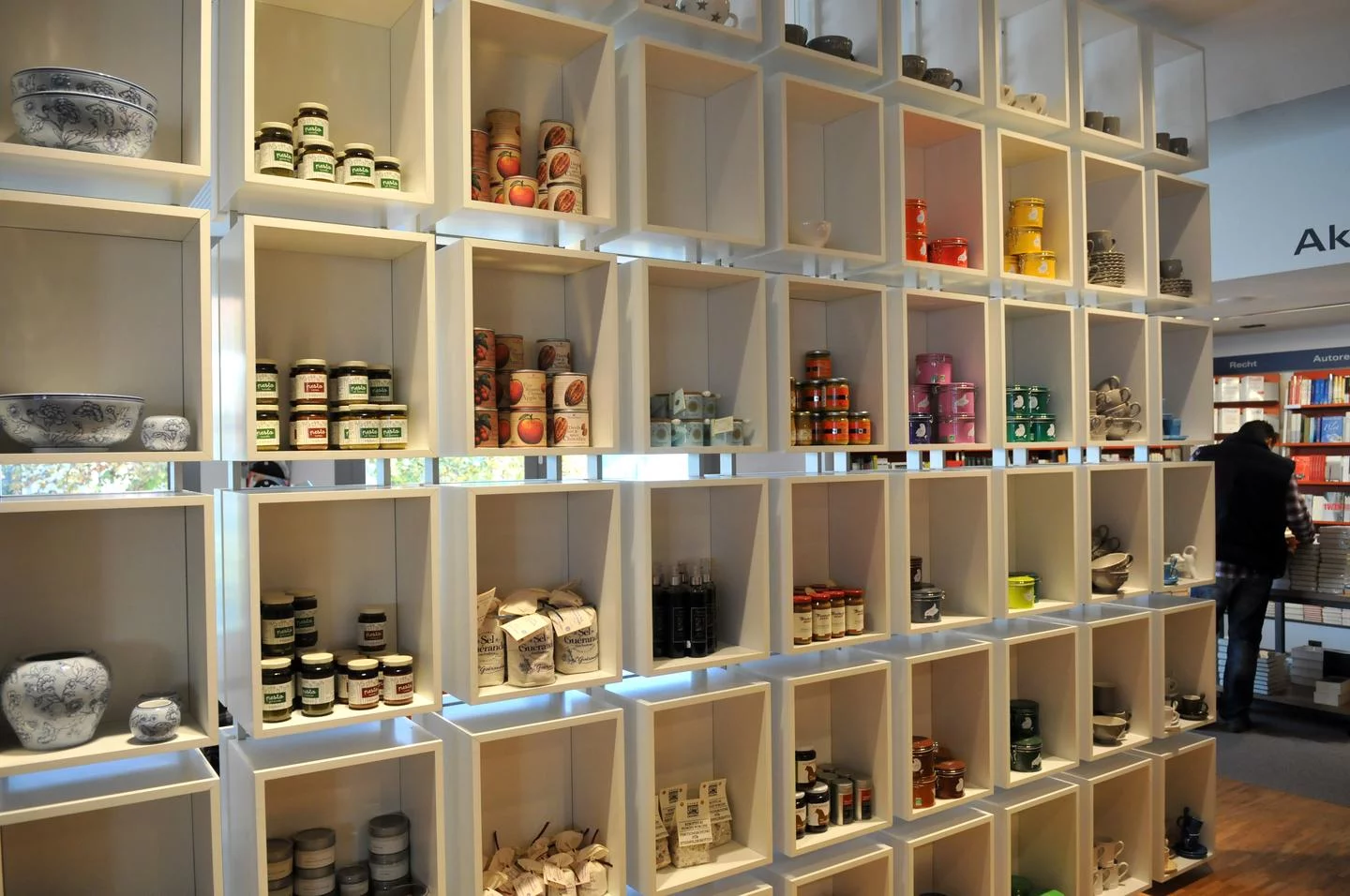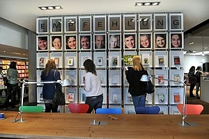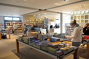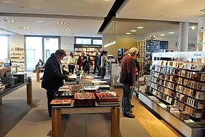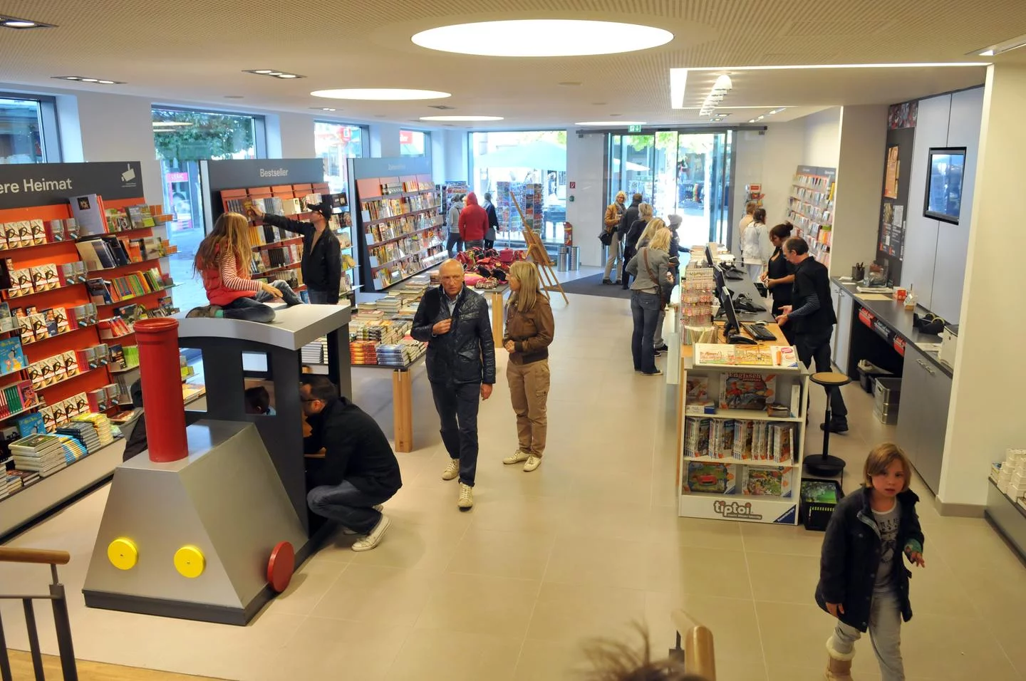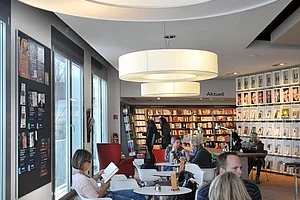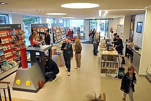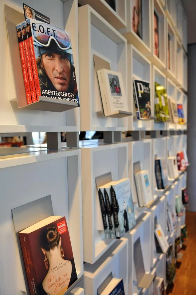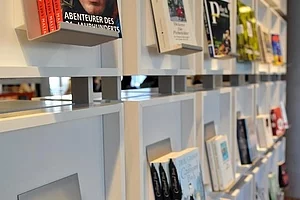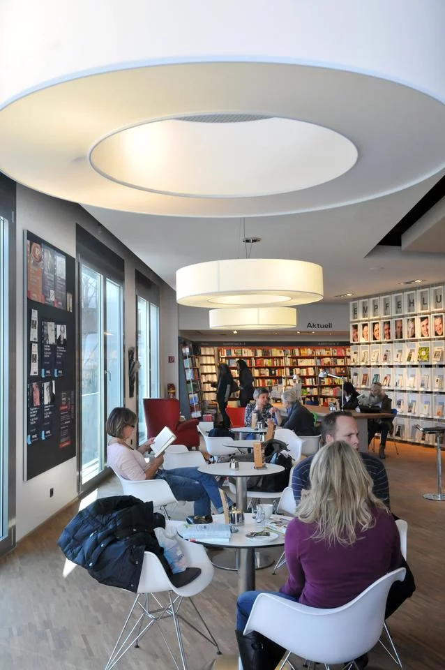 Farblich abgesetzt gliedern sich die einzelnen Sparten und Bereiche. Eine Cafeteria, mit Blick auf die Fußgängerzone und der Servicebereich "Buchabholung" bilden eine "Raum in Raum-Situation". Verstärkt durch abgehängte, geometrische Deckenelemente und neuen hochwertigen Mobiliar aus Eiche, Massivholz und weißem Corian entstand hier eine Oase zum Schmökern, Verweilen und Wohlfühlen.