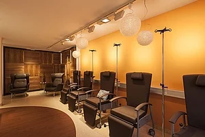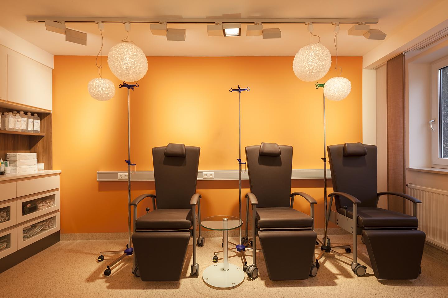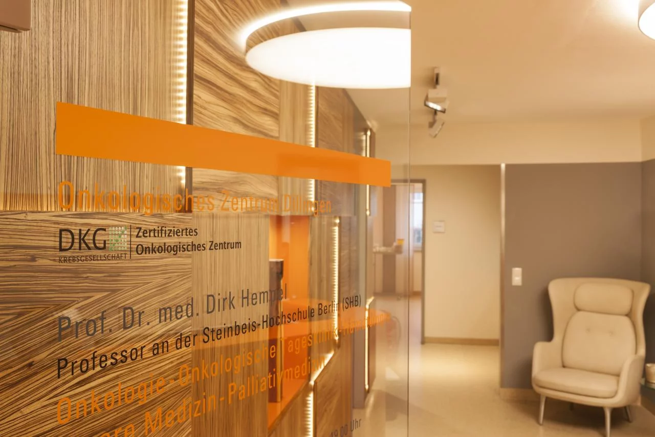 Eine onkologische Tagesklinik stellt an den Innenarchitekten besondere Anforderungen. Die Patienten sollen sich sicher, geborgen und wohl fühlen, die Mitarbeiter sollen gleichzeitig in einem funktionalen Umfeld mit optimalen hygienischen Bedingungen arbeiten können. Die Gestaltung darf sich nicht in den Vordergrund drängen, um die Menschen nicht zu überfordern. All dies konnte im onkologischen Zentrum Dillingen verwirklicht werden. Die Klinik befindet sich in einem historischen Gebäude, dessen Charme im Kontrast zur neuen Möblierung besonders betont wird. Der Kontrast von klaren Farben, Formen und Materialien zum Altbau schafft reizvolle Effekte und Harmonie zugleich.