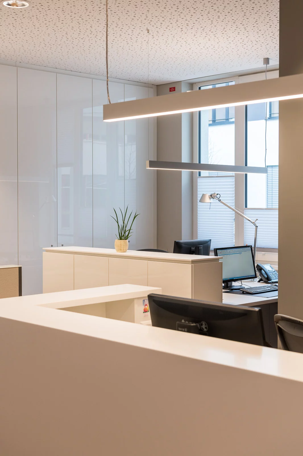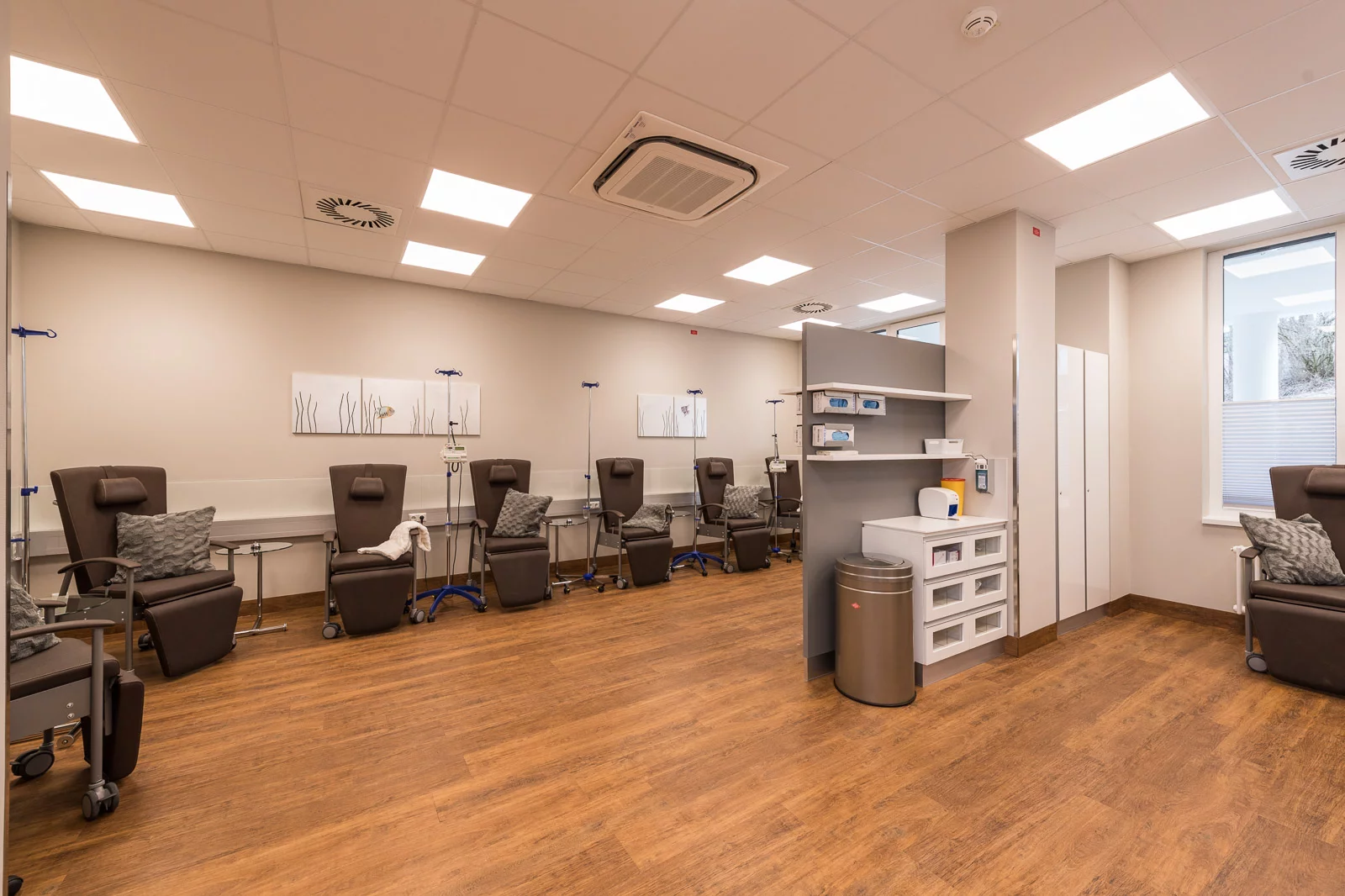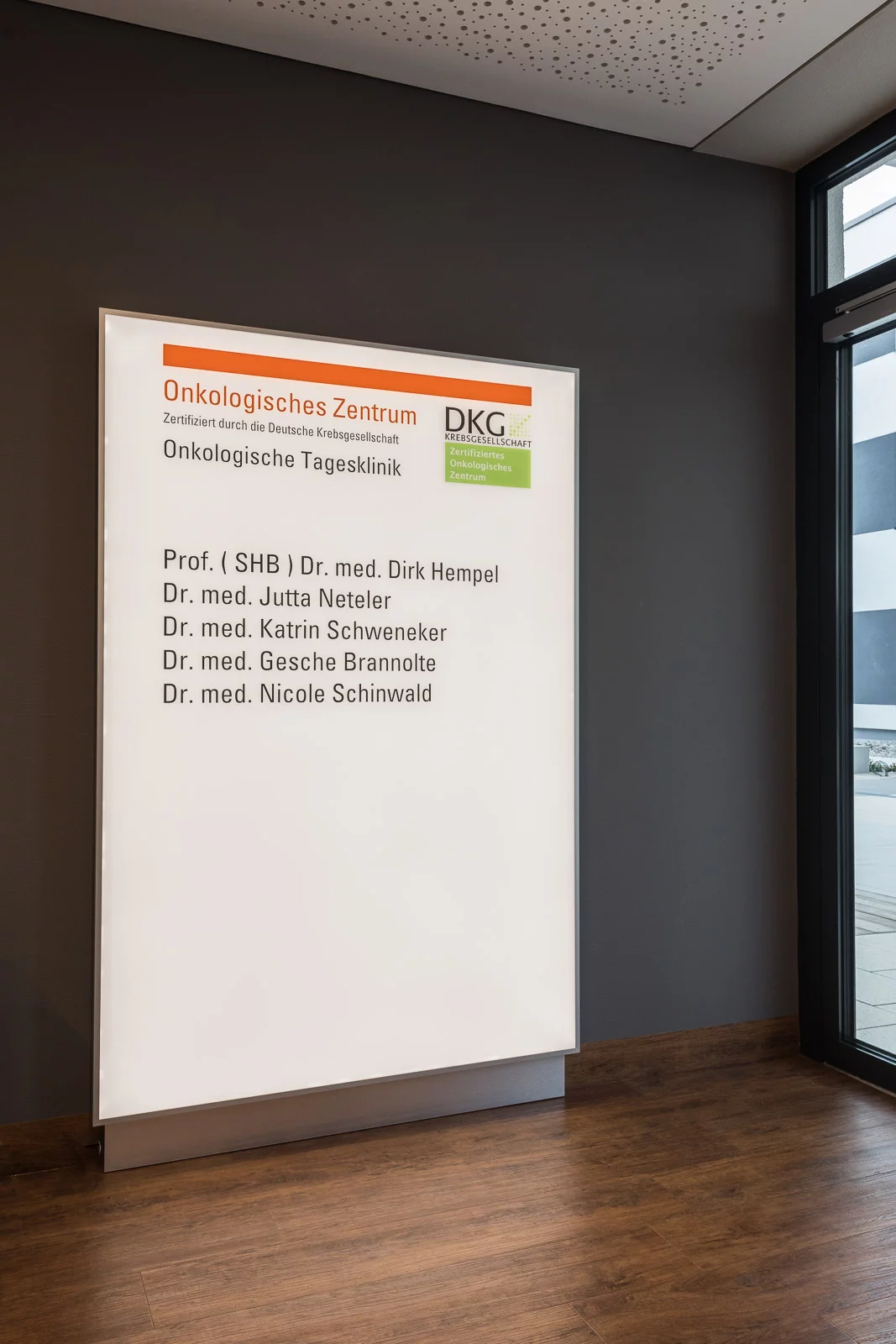 Das Onkologische Zentrum Prof. Dr. med. Dirk Hempel in Dachau ist bereits das siebte Projekt für diesen Bauherrn. Das Corporate Design seines Unternehmens hatte sich mit den Jahren weiter entwickelt und die neue Praxis ist nun Abbild der modernen jetzt weniger bunten Gestaltung.