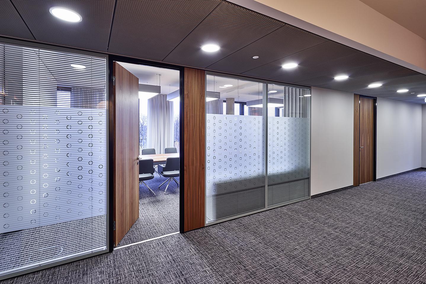 Das Logo der Kanzlei findet sich diskret an den umliegenden gemusterten Glaswänden, die gleichzeitig Licht einlassen und Diskretion für die Besprechungen wahren.