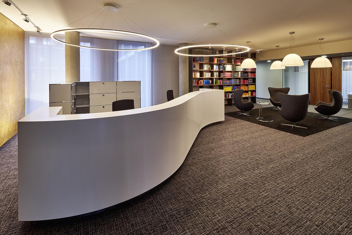 Der großzügige Eingangsbereich wurde durch ein ausgeklügeltes Beleuchtungs- und Möblierungskonzept in einen Empfangs- und einen Wartebereich zoniert. Die Empfangstheke bildet die zentrale Anlaufstelle für Mandanten und Besucher. Sie steht schwungvoll vor einer blattvergoldeten Wand und bildet zusammen mit dem eleganten Wartebereich das Herzstück der Repräsentationsflächen.