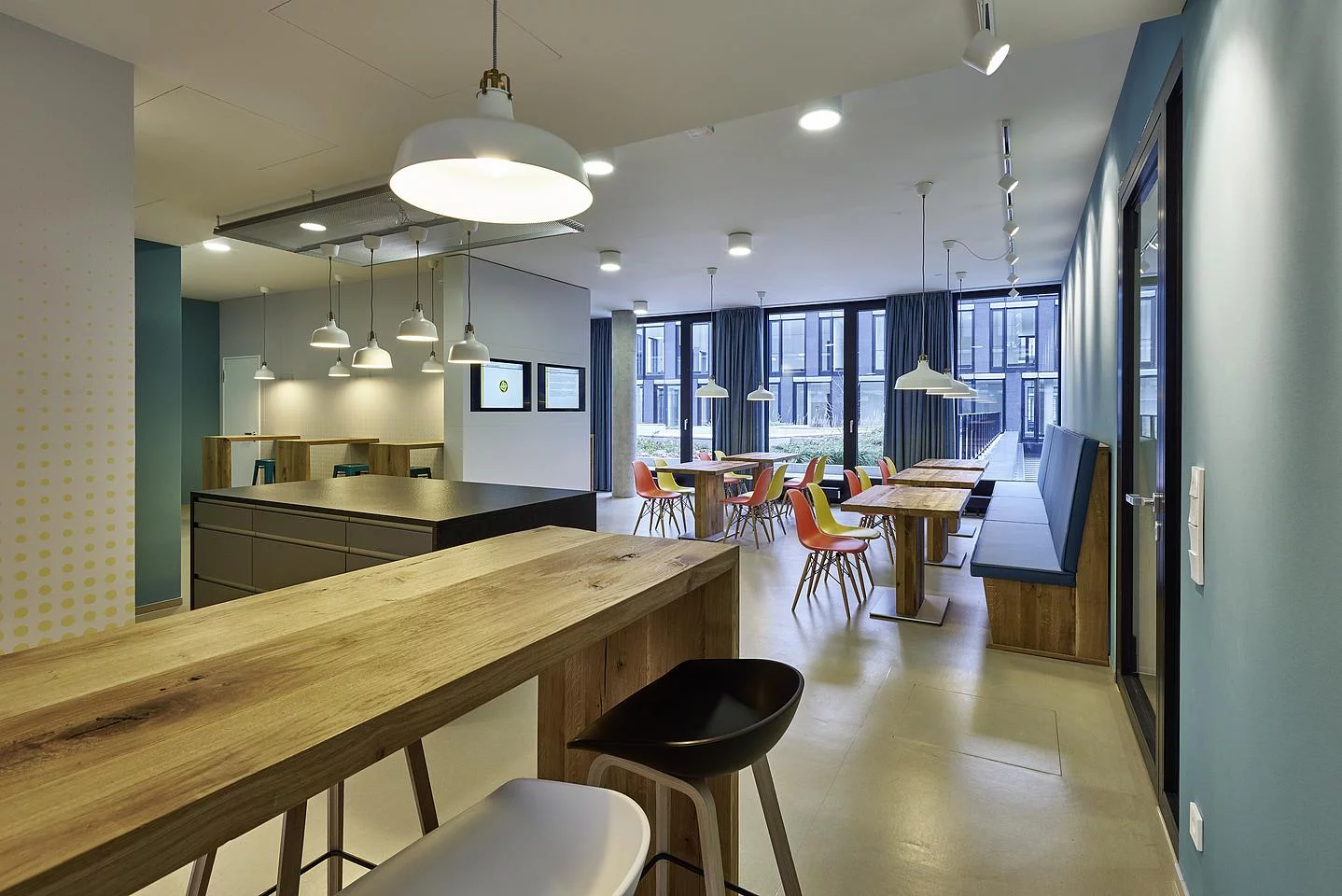 Ganz anders temperiert als die „offiziellen Flächen“ zeigt sich der Personalbereich: entsprechend seiner Nutzung als stark frequentierter sozialer Raum wurde er in peppigen Farben und mit einladendem, freundlichen Mobiliar ausgestattet. Das Gestaltungskonzept schafft unterschiedliche Raumzonen mit hoher Aufenthaltsqualität.