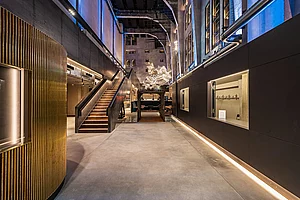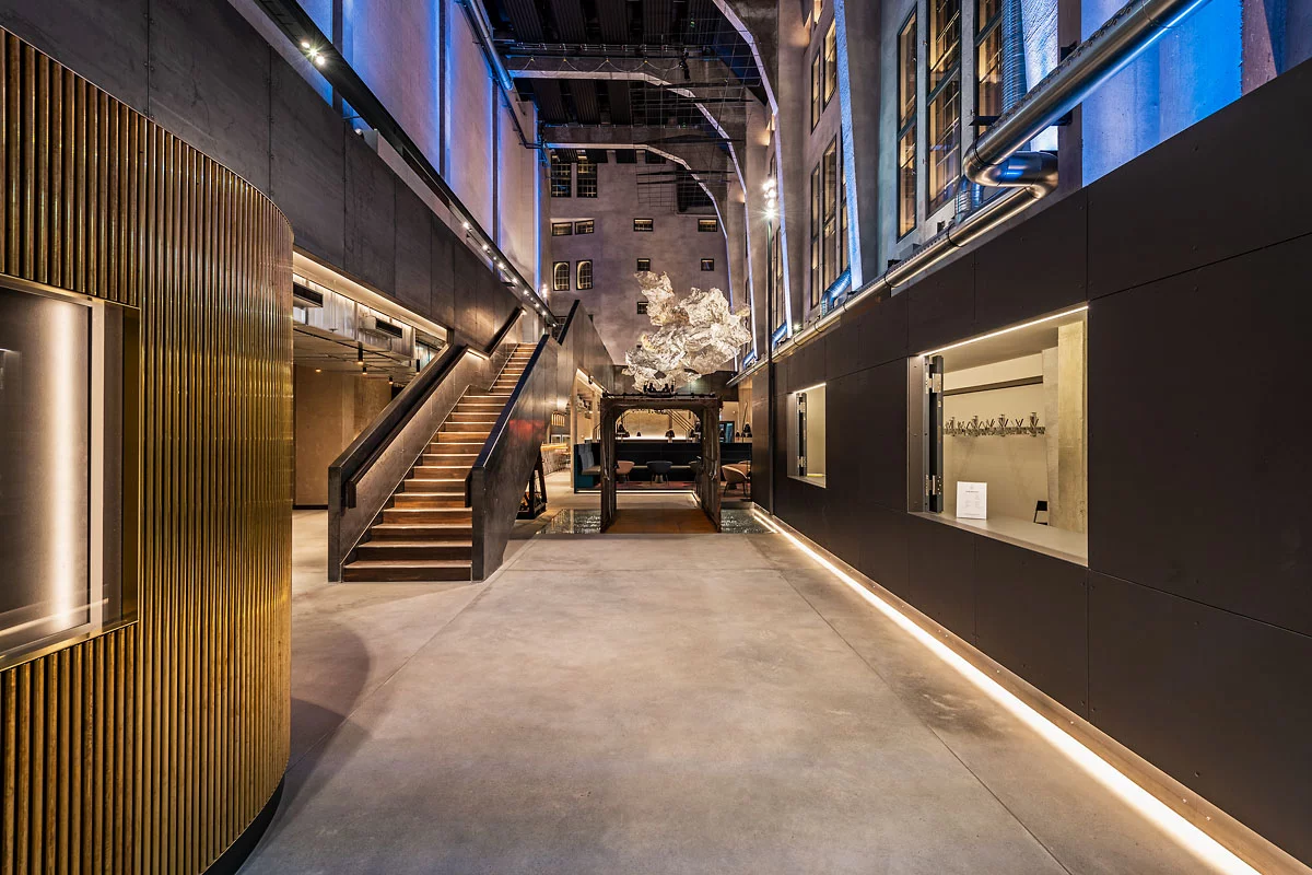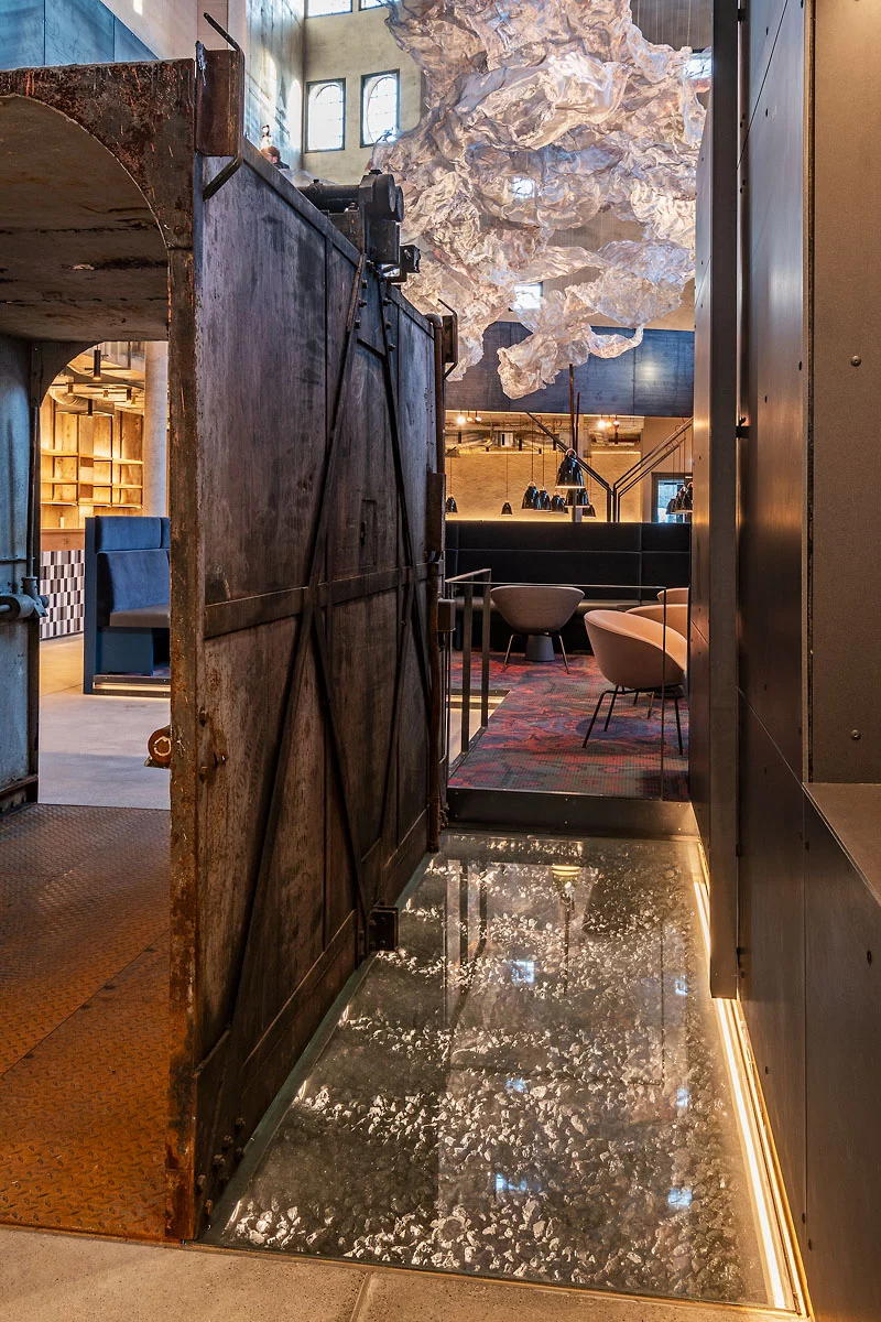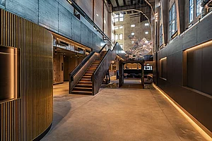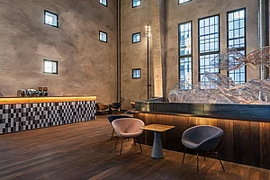 Im vollständig entkernten Hauptraum mit einer Höhe von ca. 19 Meter waren ursprünglich Hochöfen montiert, die zur Gewinnung von Stadtgas aus Steinkohle dienten. Dieser Prozess, der mit viel Schmutz, Hitze und Dampf verbunden war, hinterließ seine Spuren im Gebäude. Es bedarf einer intelligenten Struktur um der neuen Nutzung gerecht zu werden. Weitere Herausforderungen waren bei dieser Versammlungsstätte im historischen Gebäude, Akustik, Klima und Brandschutz.