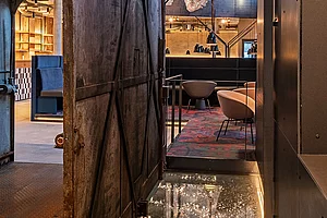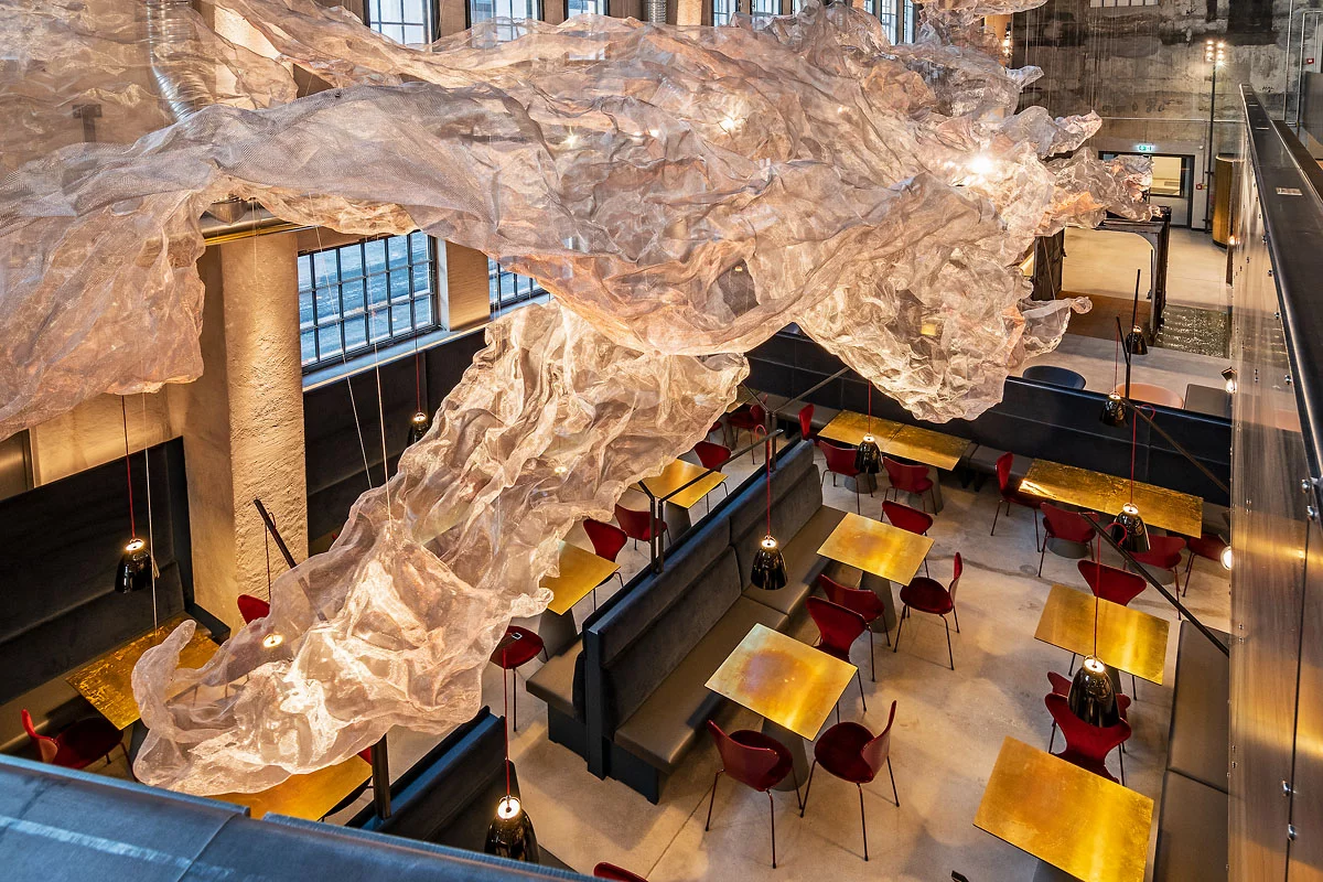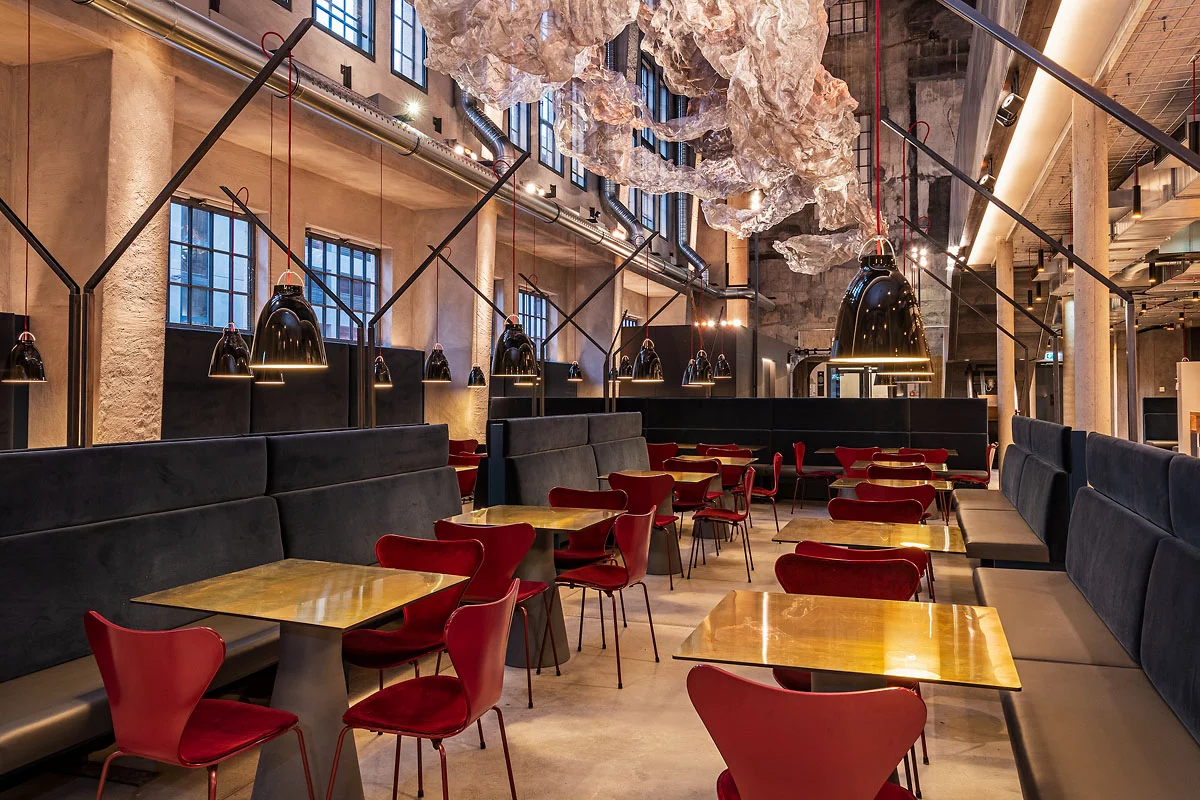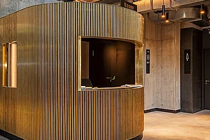 Messing, Samt, handgearbeitete Fliesen, Holz, blanker Stahl, Hohe Wandpaneele als Raumzonierung ergeben intime Sitzbereiche und sorgen für eine sehr gute Akustik.