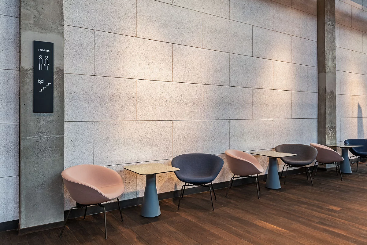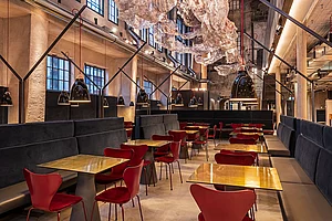 Die feinen Designklassiker (Arne Jacobsen 1955), die als Sitzmöbel in Bar, Restaurant und Loungebereich (neue Edition mit rotem Samt) zum Einsatz kamen, bilden einen spannungsreichen, eleganten Kontrast zum groben Baudenkmal. Diese waren auch Impulsgeber für Formgebung sämtlicher Einrichtungsgegenstände z.B. Tischentwürfe und Bauteil-Entwürfe, z.B. Theaterkasse.