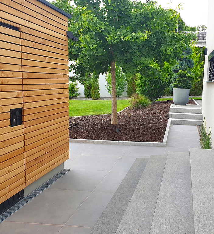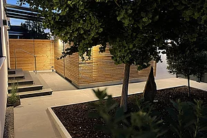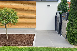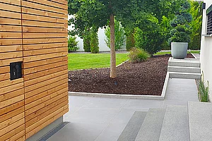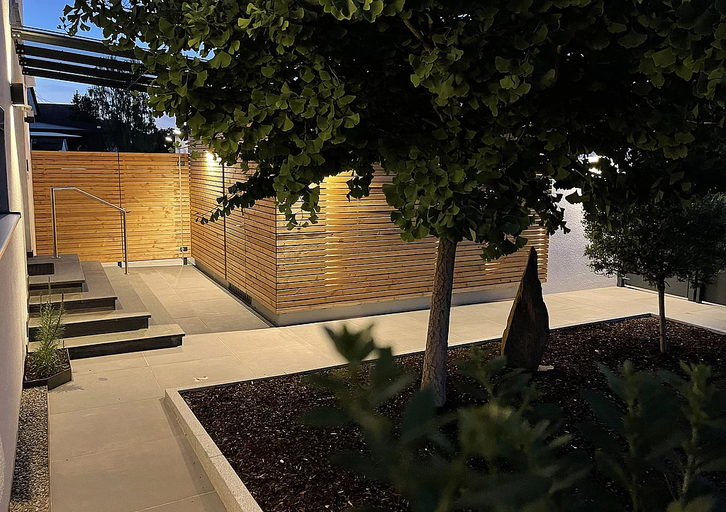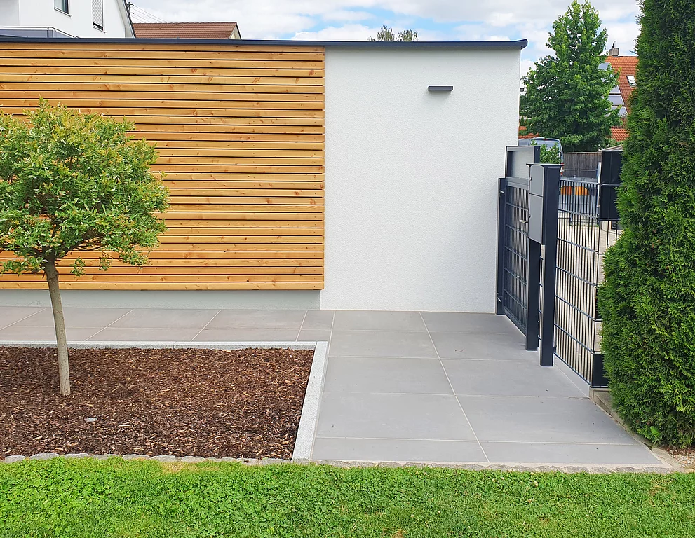 Leistung: Neugestaltung eines Eingangbereiches, Garagenfassaden, Außenbeleuchtung, LPH 1-8 und Gartengestaltung