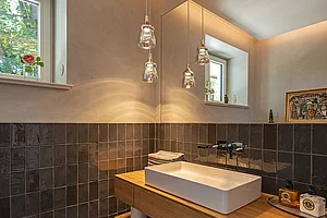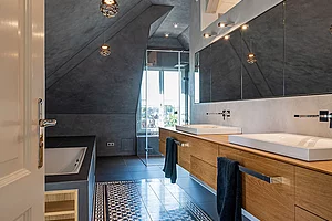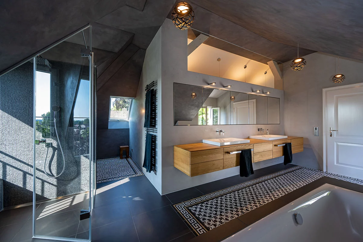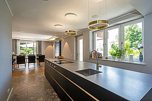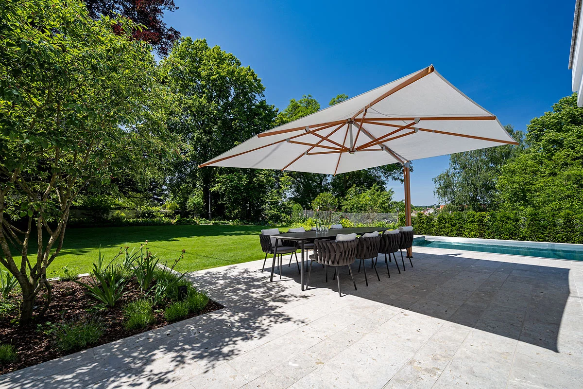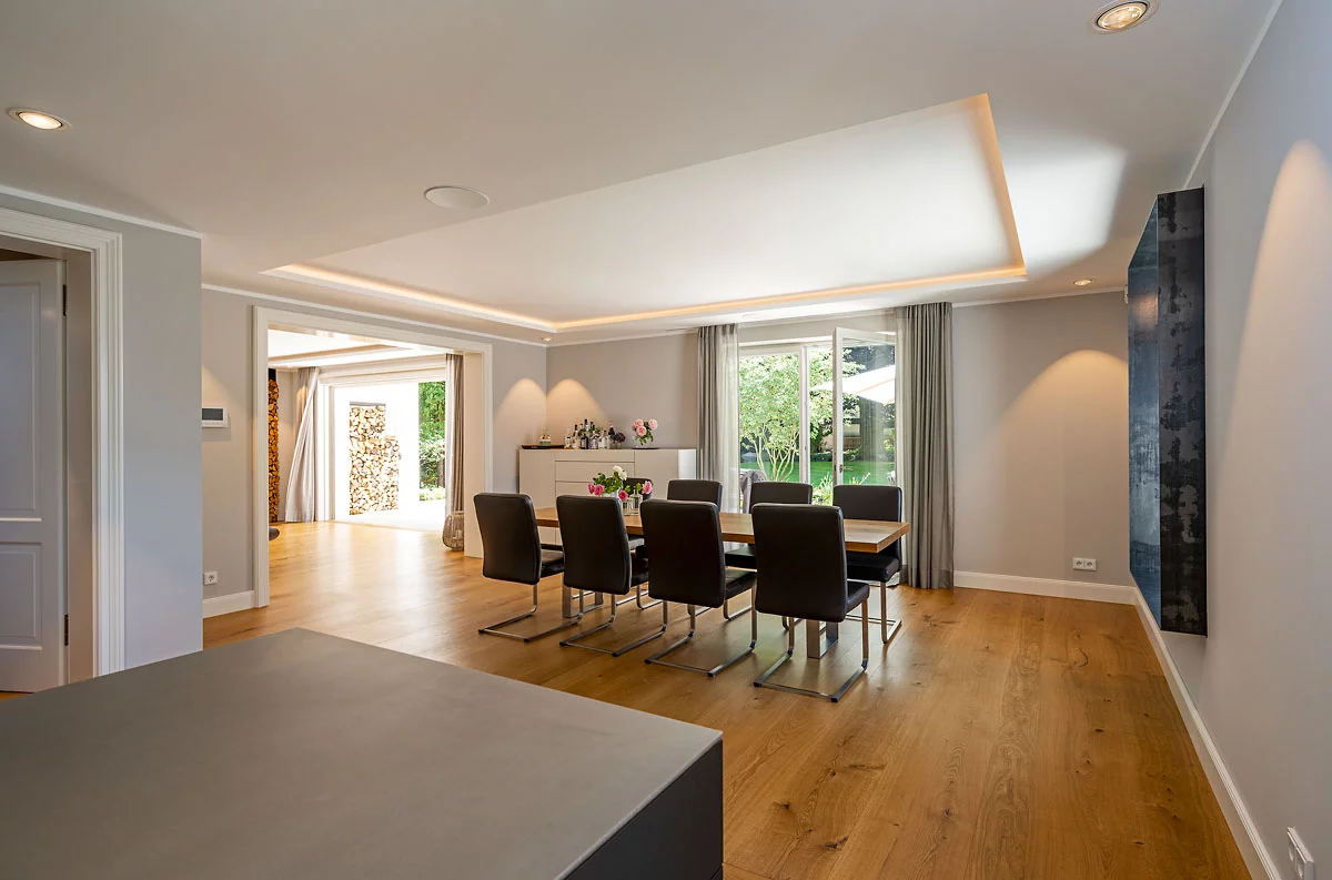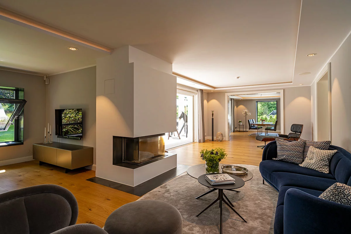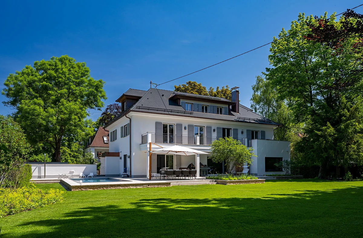 Leistung: Fassaden, Innenausbau und Inneneinrichtung einer Privatvilla sowie Planung der Außenanlagen mit Terrasse, Pool, Außensauna, Sichtschutz, LPH 1-8