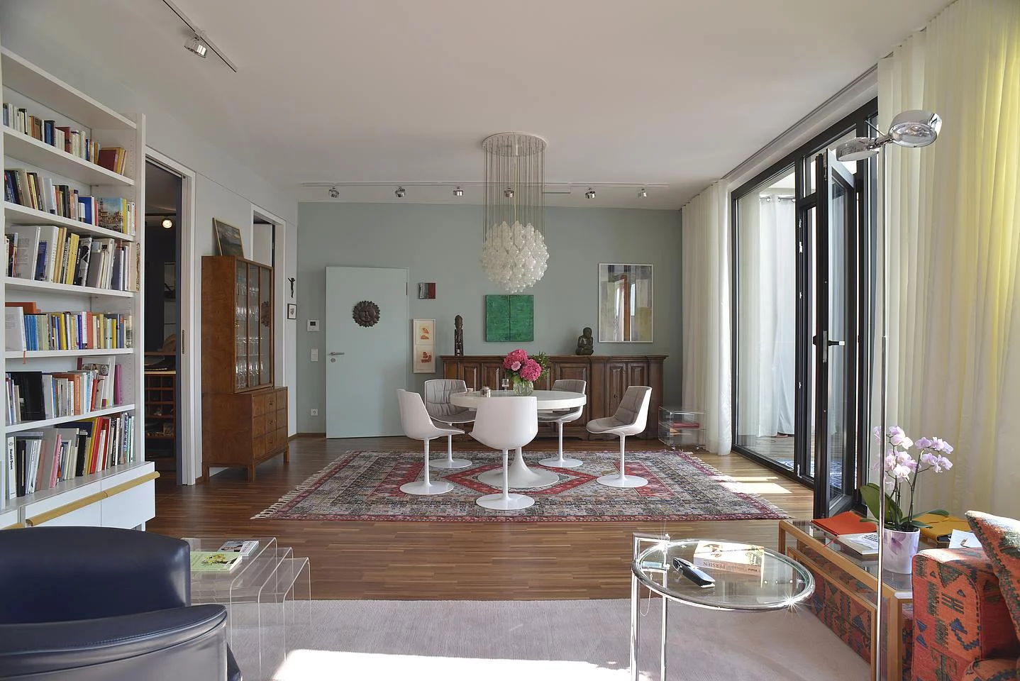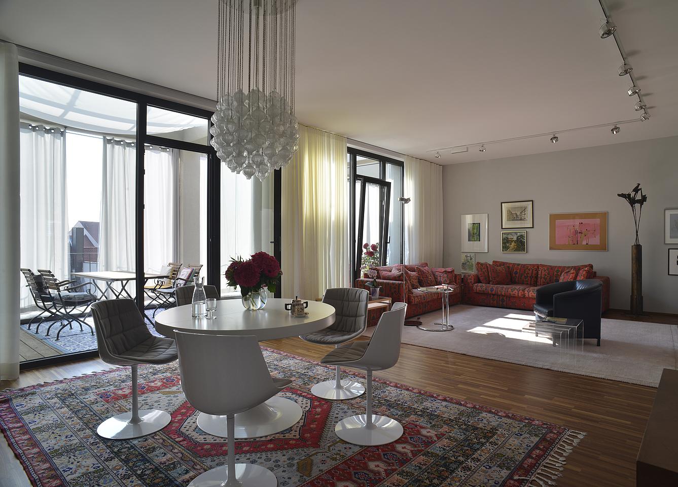 Nach strukturierenden Eingriffen in die Raumaufteilung, wurden die einzelnen Zonen mit viel Behutsamkeit gestaltet. Es galt, den Bestand an vertrauten Möbeln, Kunst-, Sammler- und Erinnerungsstücken in das neue Umfeld zu integrieren. Die gewachsene Behaglichkeit des ländlichen Hauses wurde in die moderne städtische Architektur übertragen. Ein klares Farbkonzept schafft eine Gliederung und bietet den teils sehr wertvollen Bestands-Stücken den perfekten Rahmen. Geschickte Lichtführungen erzeugen gleichzeitig Größe und Intimität, ganz nach den Bedürfnissen der Bauherren.